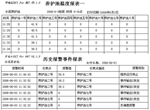 7.可隨時打印實(shí)時8個數(shù)據(jù)曲線圖表、8個歷史數(shù)據(jù)曲線顯示圖表及每5秒數(shù)據(jù)表和班報(bào)、日報(bào)、報(bào)警報(bào)表。
