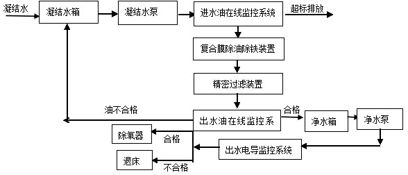 工藝流程:控制外來凝結(jié)水進(jìn)入凝結(jié)水箱,有凝結(jié)水泵經(jīng)過除油除鐵、過濾系統(tǒng),對合格的水進(jìn)入凈水箱,由凈水泵打入工藝系統(tǒng)管網(wǎng)中,對于不合格的再循環(huán)回收。